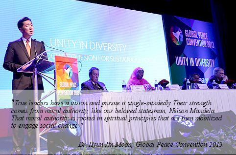 The quote is taken from the opening plenary address at the Global Peace Convention 2013 given by Dr. Hyun Jin Moon, Chairman of the Global Peace Foundation.