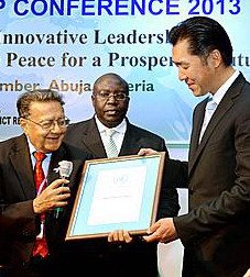 Dr. Manu Chandaria, CEO Comcraft Group and Special Advisor of GPF Africa presents Dr. Hyun Jin Moon, with the award conferred to the Global Peace Foundation Kenya in 2013 by the United Nations for effort with youth and peace.