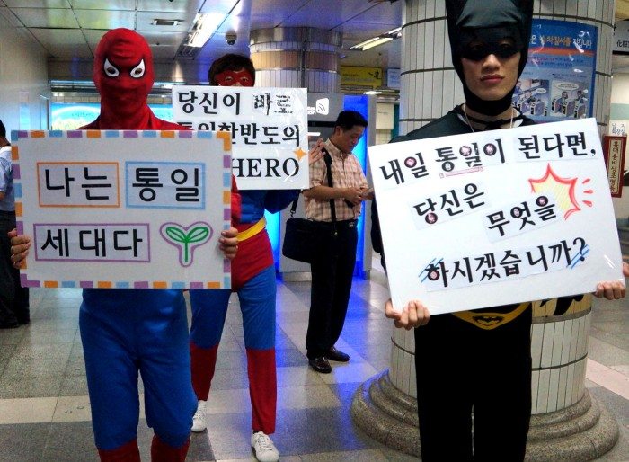 Local and international youth volunteers pose as “Unification Heroes”, members of a rising “Unification Generation”