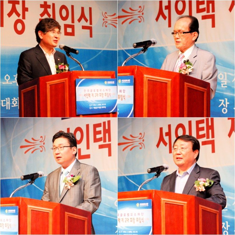 Political and civic leaders offer congratulations at the inaugural ceremony. Clockwise from top left: Jaeyun Kim, New Politics Alliance for Democracy; Cheolgi Lee, National President of the National Advisory Council; Youngjun Kim, Senior Vice-President of Global Peace Foundation; Gapsan Lee, Korean NGO Association