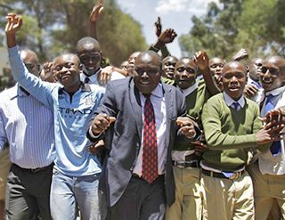 Kenya’s number 1 student, Tom Wanderi King’ori (left), and principal Mr. David Gideon Kariuki, surrounded by other students from Alliance High School celebrate the school’s outstanding performance.