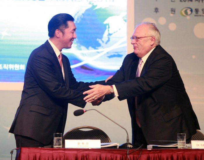 Dr. Hyun Jin Moon greets Dr. Edwin J. Feulner, founder of The Heritage Foundation and Chairman of the Asian Studies Center at the 2014 Global Peace Leadership Conference in Seoul.