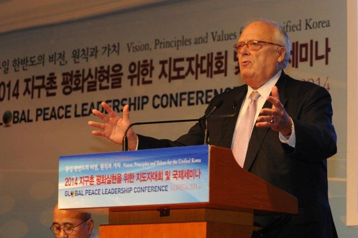 30-Sep-2014 |“In the three years since the Global Peace Foundation (GPF) held its annual convention here in Seoul, the landscape regarding Korean unification has changed dramatically,” GPF Chairman Dr. Hyun Jin Moon told an assembly of Korean political and religious leaders and international scholars in Seoul on September 30, 2014. “South Korean government policy is now to actively pursue peaceful unification by seeking to engage the North through a number of channels, [including] proposed infrastructure projects, as well as cultural exchanges with the North Korean people. In policy discussions within South Korea there is now much greater focus on the potential benefits that will flow from peaceful unification.” The GPF Chairman was addressing the 2014 Global Peace Leadership Conference (GPLC), “Vision, Principles, and Values of a Unified Korea,” the latest of several GPF-supported initiatives, including conferences, public education and humanitarian campaigns, and civil society partnerships, to elevate awareness and support for Korean unification. Dr. Victor Cha, Senior Adviser and Korea Chair at the Center for Strategic and International Studies in Washington, DC, gave an overview of the changing perspectives of unification since the division of the peninsula and the end of the Korean War and what he called “an important sea-change” in recent attitudes about unification.