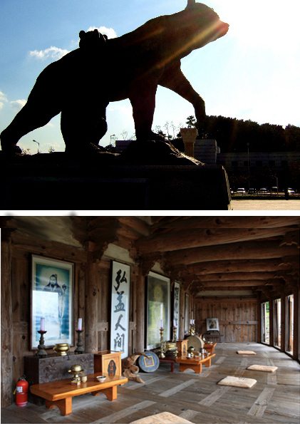 Top: A bronze statue depicting the bear from the Tangun myth in front of Dankook University. (Photo Credit: HanKooKin) Bottom: The main temple at Samseonggung. (photo: Steve46814)