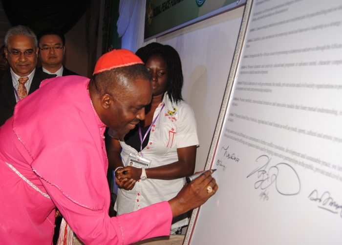 Bishop Sunday Onuoha adds his signature to the Abuja Declaration at the close of GPLC 2013. International delegates from over 20 nations pledging to “Create a strategic platform to promote universal principles for peacebuilding and our shared values as One Family under God.”