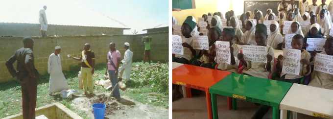 One Family Under God Campaign projects (left to right) Improving security and grounds of a local hospital. (right) Donating desks and chairs to a local school that educations Muslim and Christian boys and girls.