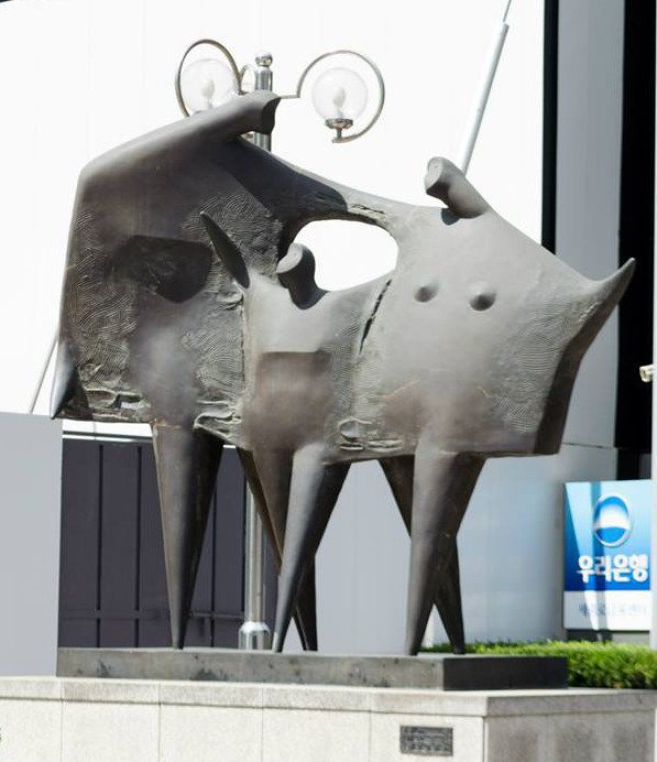 An abstract depiction of “uri jeep“, our home, in downtown Seoul, and the logo for “Woori Bank”, our bank, in the background.